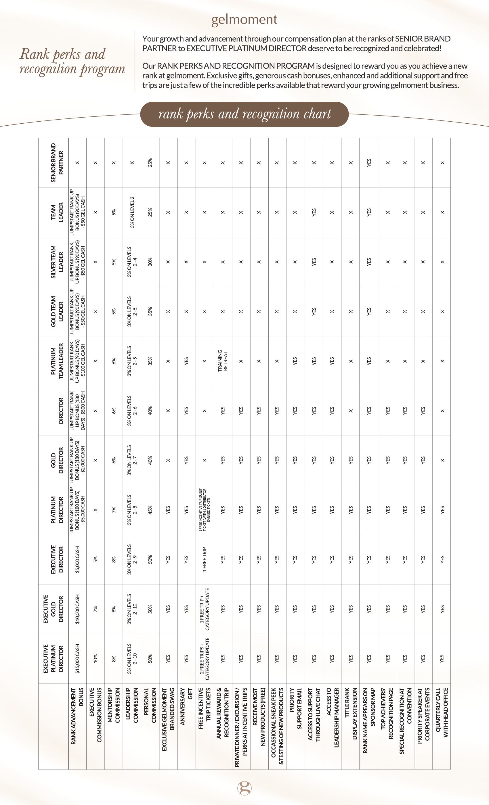 Our RANK PERKS AND RECOGNITION PROGRAM is designed to reward you as you achieve a new rank at gelmoment. Exclusive gifts, generous cash bonuses, enhanced and additional support and free trips are just a few of the incredible perks available that reward your growing gelmoment business.